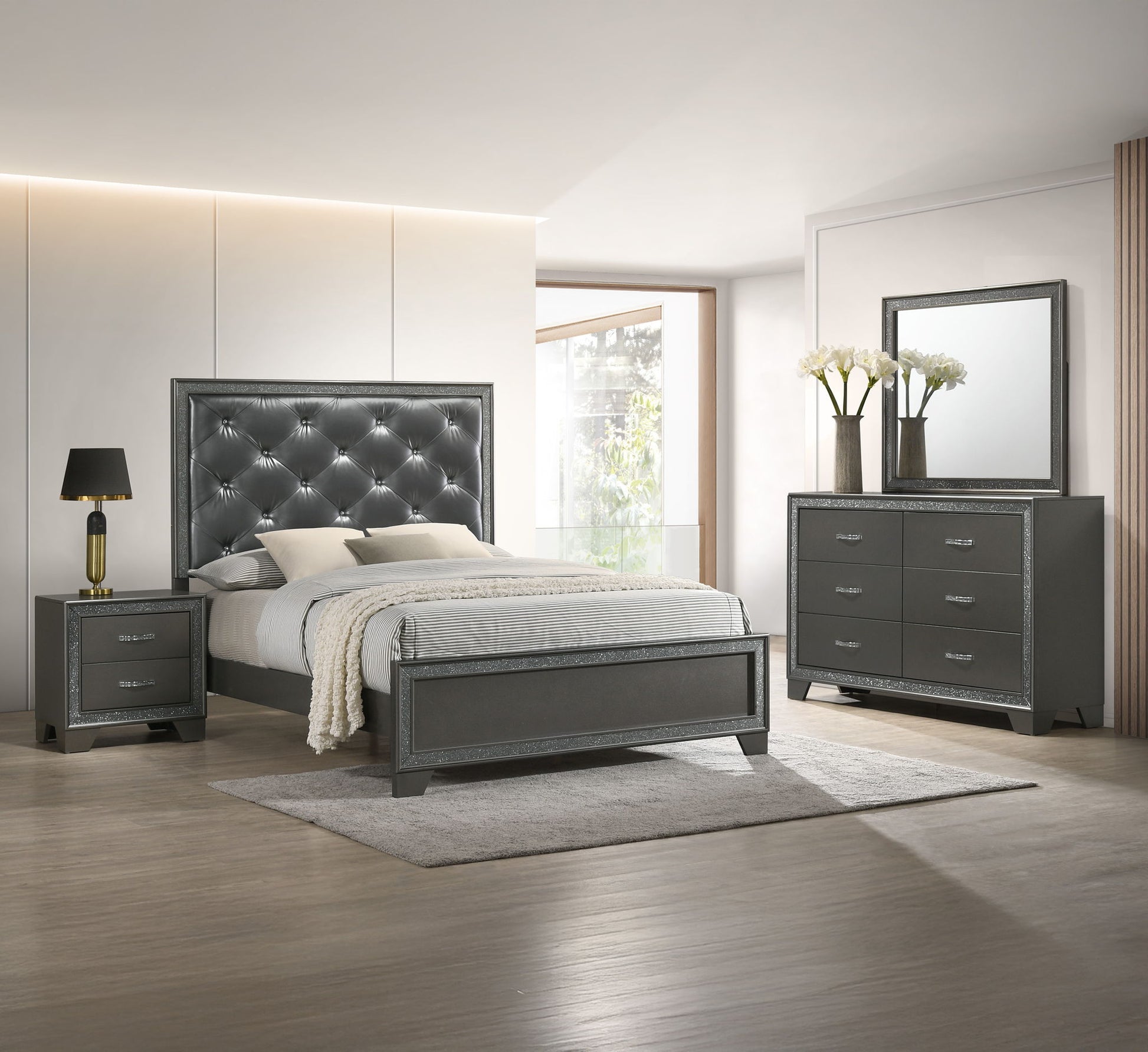 This luxurious bedroom collection exudes opulence with its dark, shimmering finishes and plush, tufted upholstery. The bed is a showstopper, featuring a high, tufted headboard that invites you to recline in comfort and style. Accompanying the bed are a matching dresser and chest, each boasting a sparkling trim that frames the rich, dark panels and complements the sleek, contemporary handles. The nightstand echoes the elegance of the bed, providing a convenient bedside space that doesn't skimp on glamour. Topped off with a generously sized mirror, the dresser completes this ensemble, reflecting both light and refined taste.
