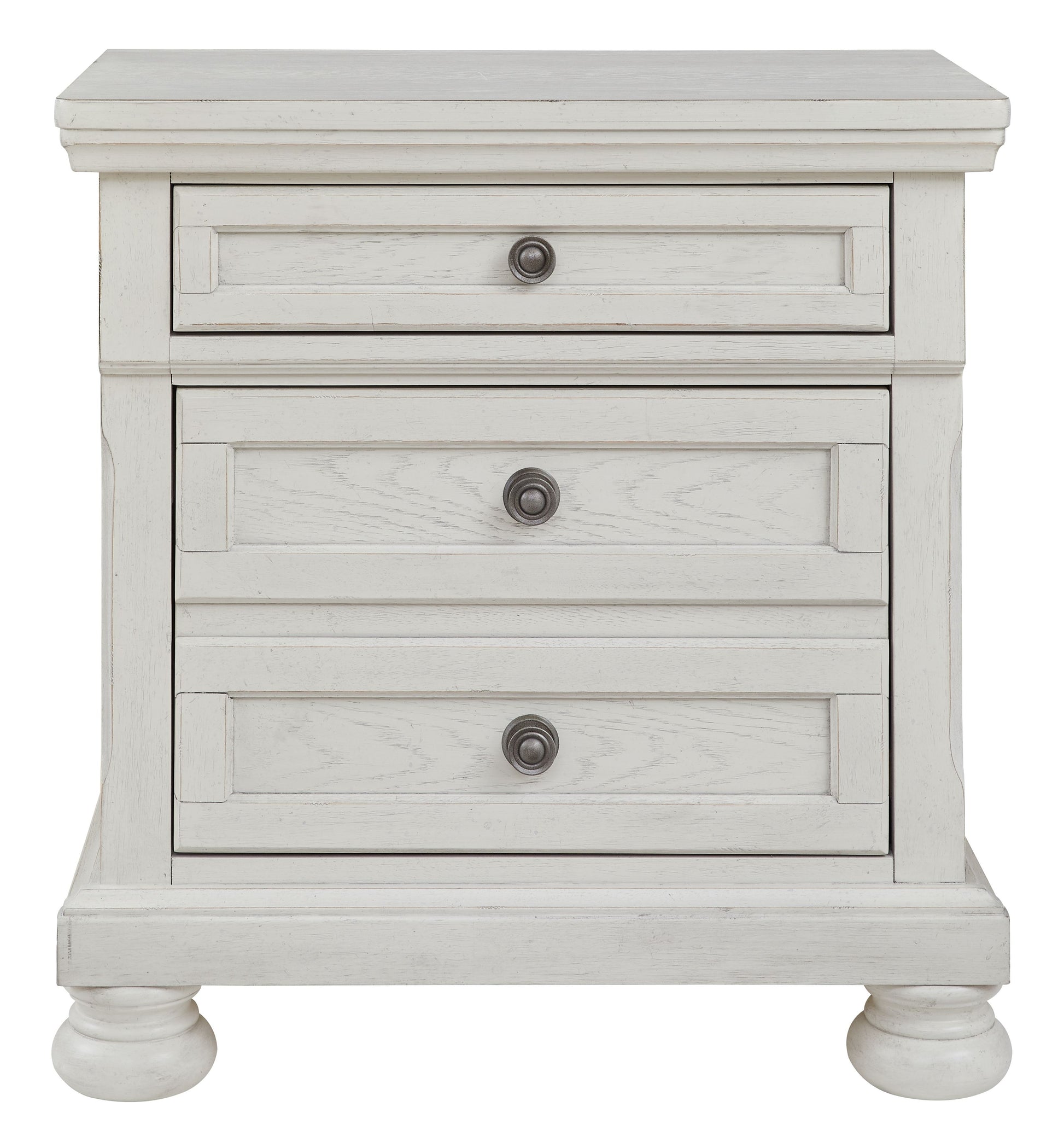 Elegant, timeless furnishings take your bedroom to the next level. Nothing does that better than this nightstand. The antiqued white finish with a wonderful grain texture radiates sophistication, while the dark bronze-tone hardware adds an ornate touch. A hidden pull-out tray behind the bottom drawer puts your small valuables out of sight. Felt finishing in the top drawer and a hidden pull-out tray rounds out the piece for the ultimate tasteful bedroom.
